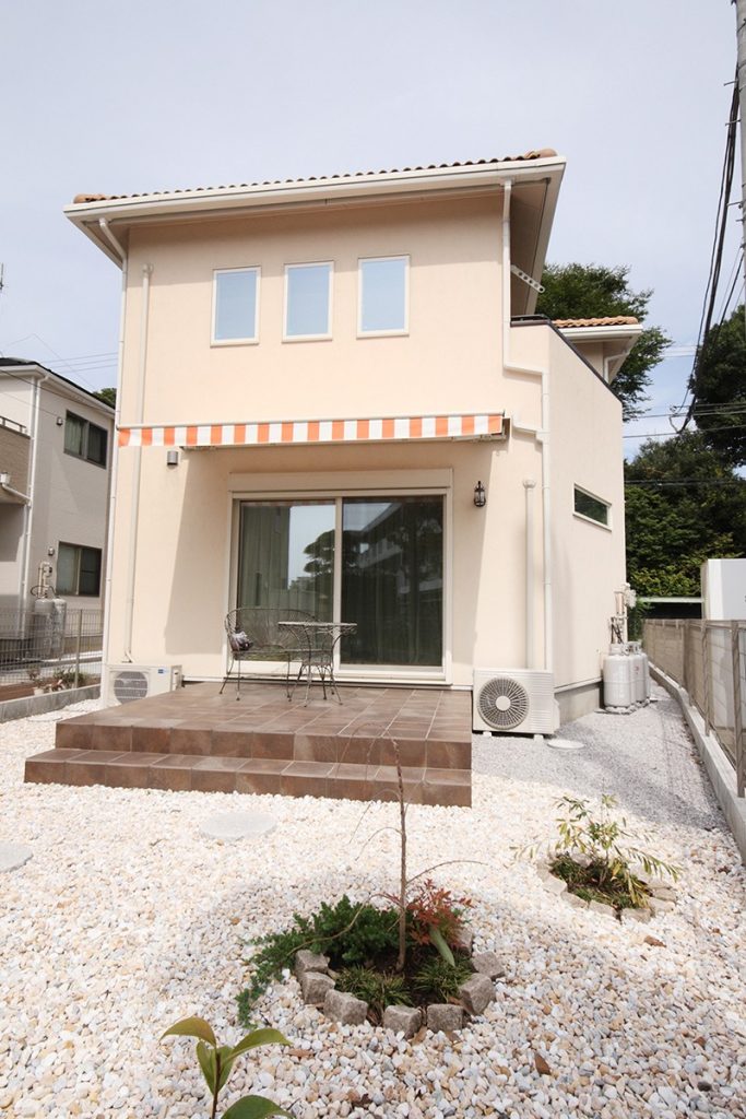 こちらのオレンジのアクセントカラーが印象深いカフェ風モダンのおしゃれな家は、シンプルながら可愛らしい外観になっています。