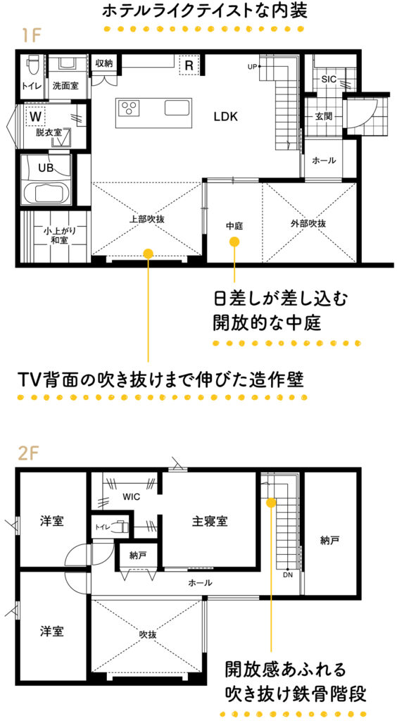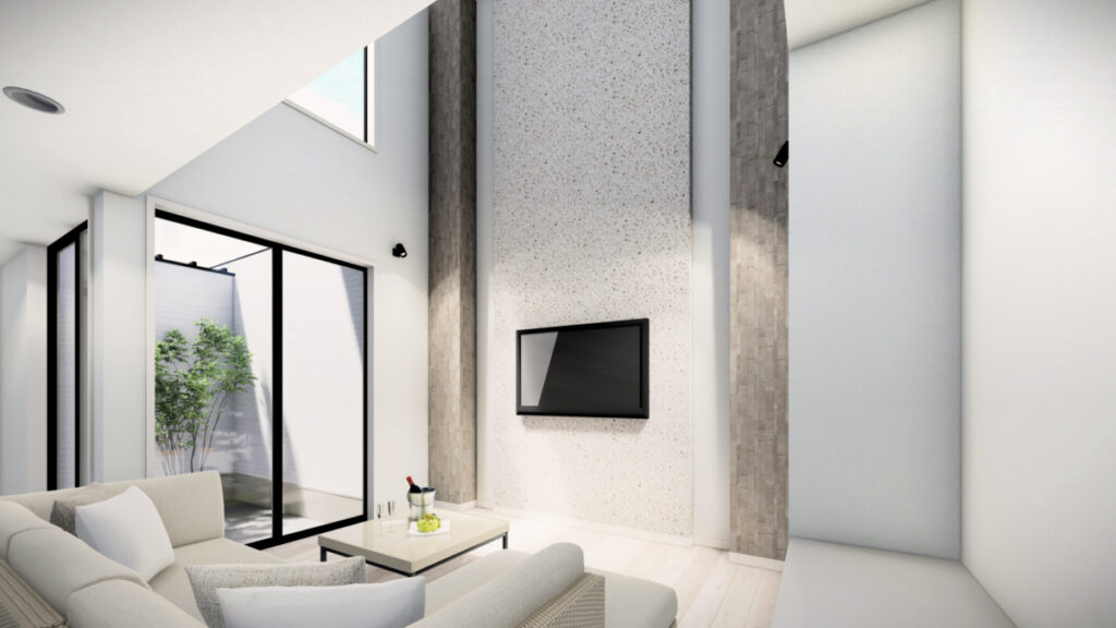 リビングでは、TV背面から吹き抜けまで伸びたダイナミックな造作壁が空間に奥行きを与え、デザイン性の高い吹き抜け鉄骨階段が開放感を一層高めています。