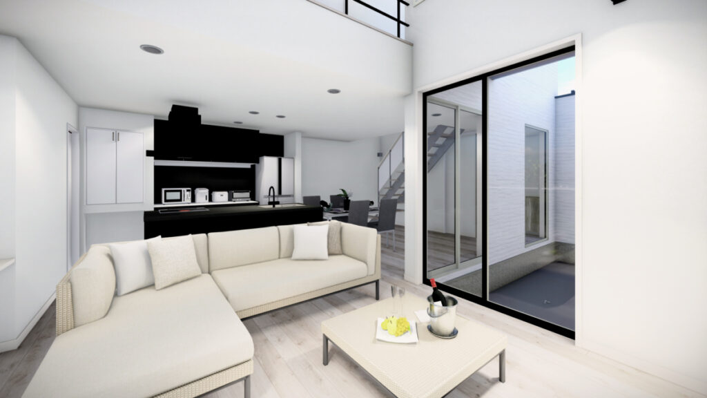 また、大きな窓から日差しが差し込む開放的な中庭を設けることで、都会にいながら光と風を感じることのできる暮らしを実現しました。